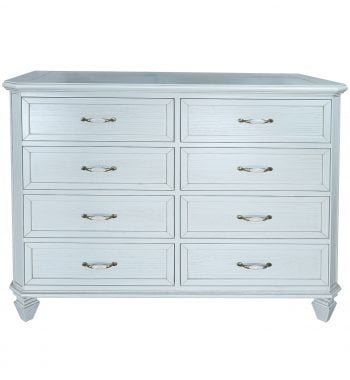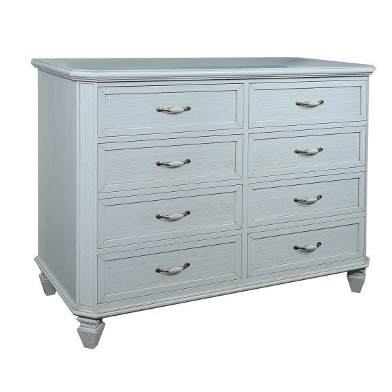 Die Kommode mit massiven Beinen ist aus Esche hergestellt. Der Farbanstrich betont die Holzporen der Möbel aus Esche, die Möbel sehen schön und gealtert aus.