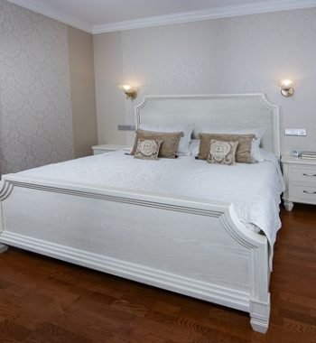 Ein festes Bett der Kollektion Nele im klassischen Stil ist aus Esche hergestellt. Massive Beine gewährleisten die Festigkeit und Stabilität des Möbelstücks.